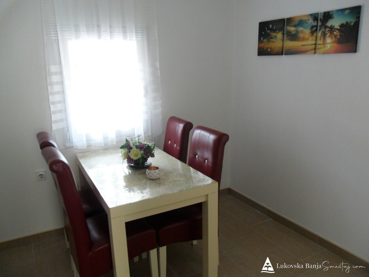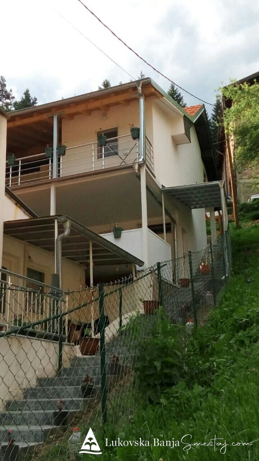 Na spratu je apartman sa 2 sobe. Jedna soba je dvokrevetna sa kupatilom, a druga je sa francuskim ležajem i kupatilom. Kuhinja i trpezarija su izdvojene kao posebne prostorije. Sprat se može izdavati kao apartman ili kao zasebne sobe.